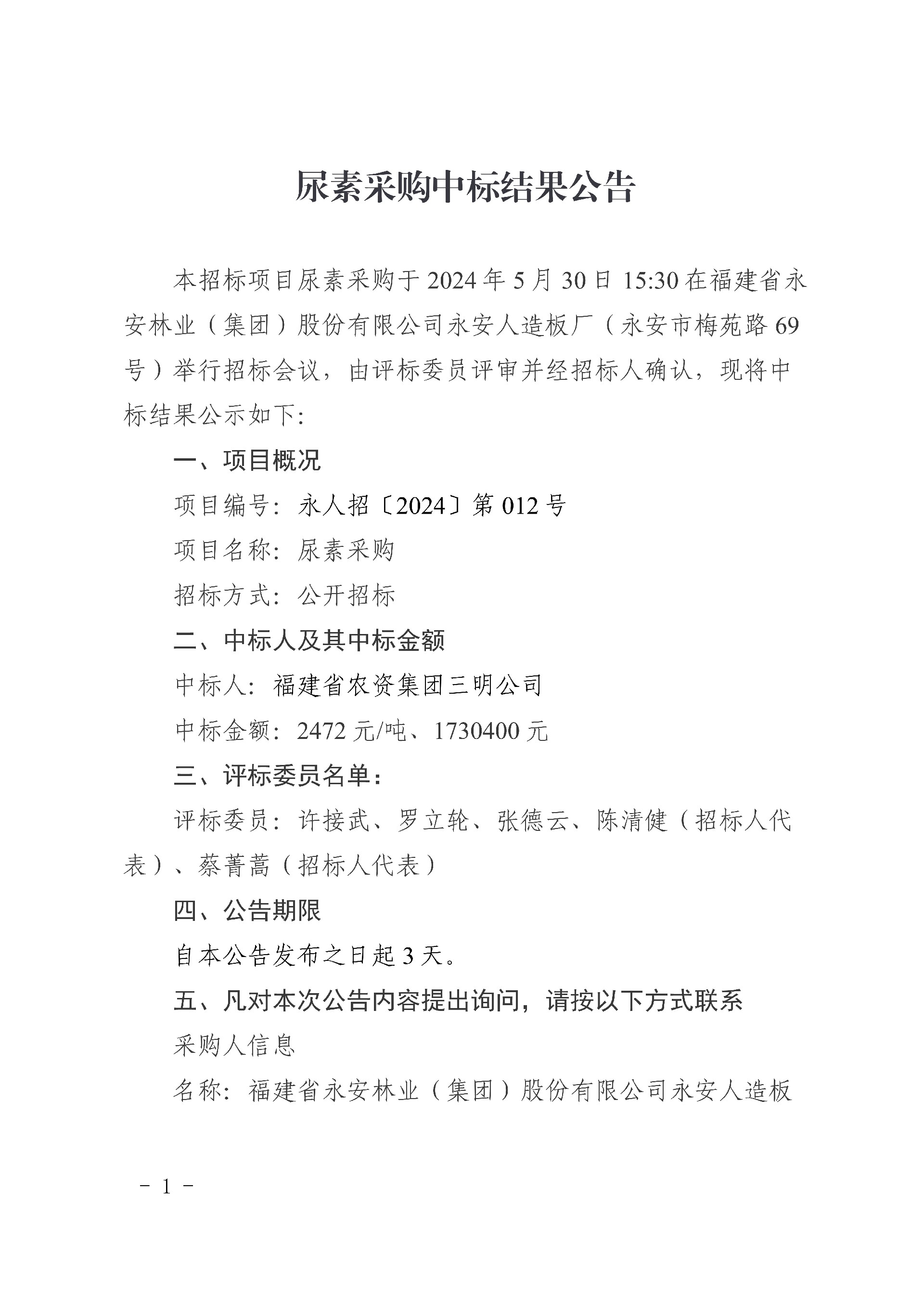 永安人造板廠尿素采購(gòu)中標(biāo)結(jié)果公告