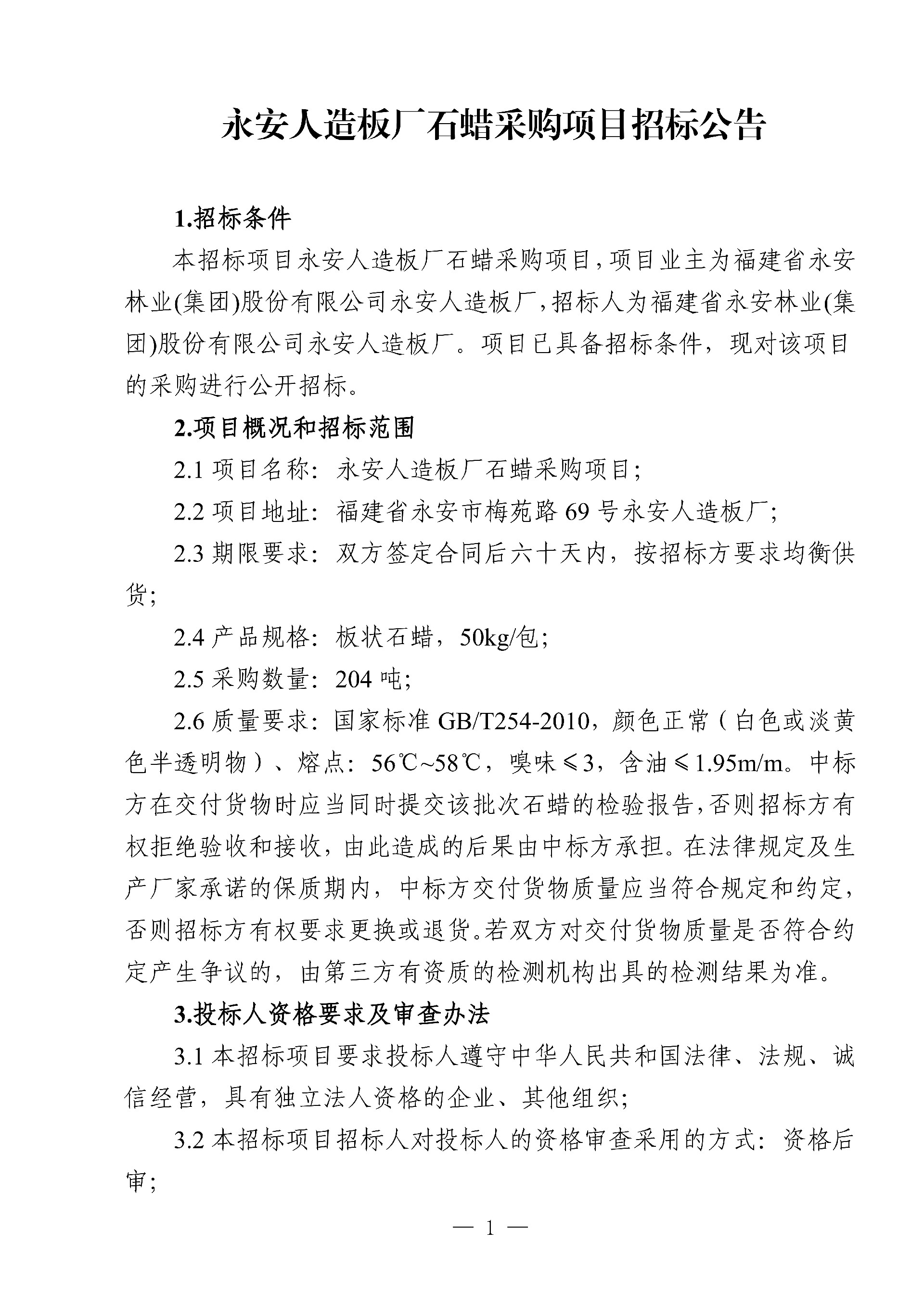 永安人造板廠石蠟采購項目招標(biāo)公告