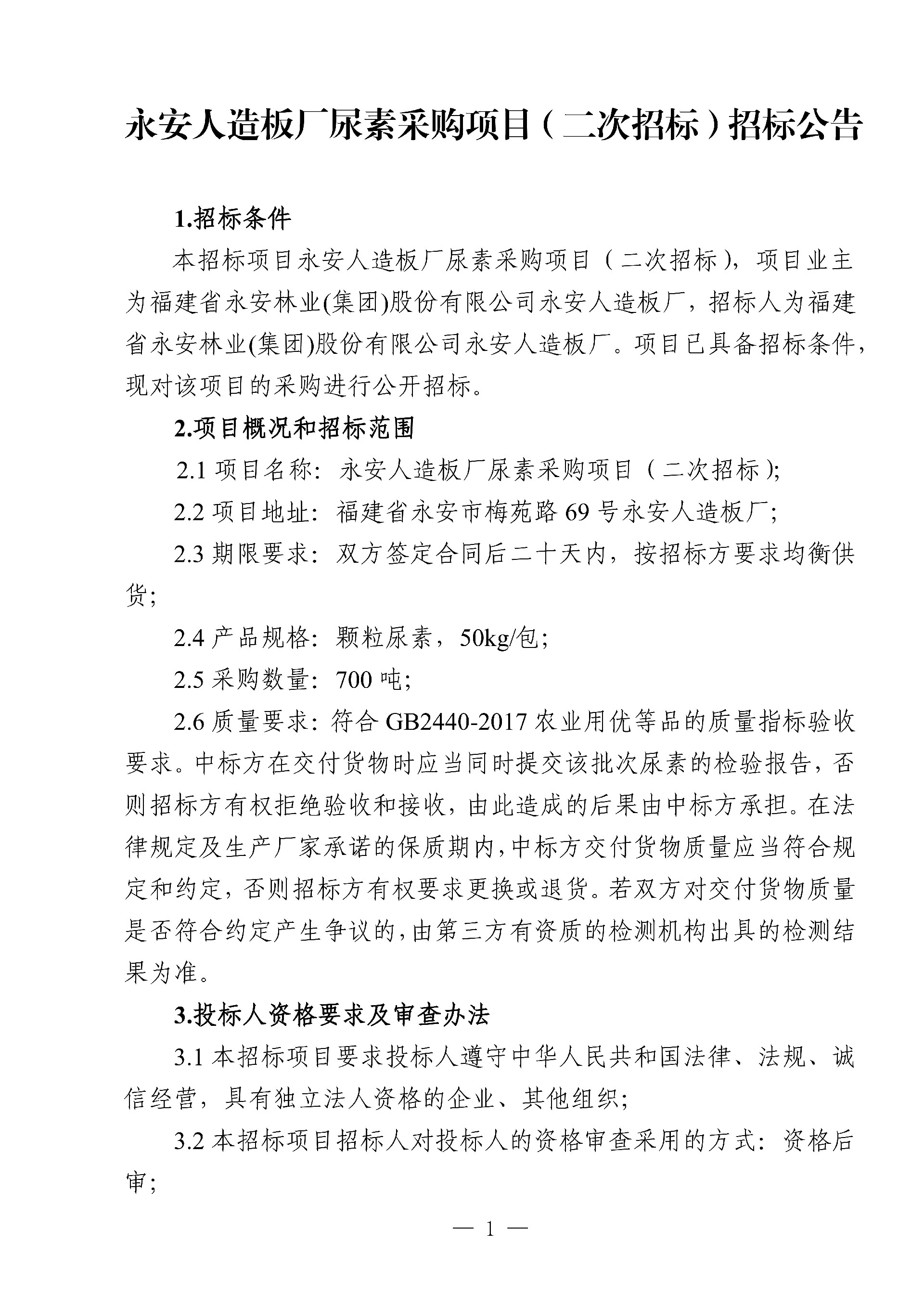 永安人造板廠尿素采購項目 (二次招標)招標公告