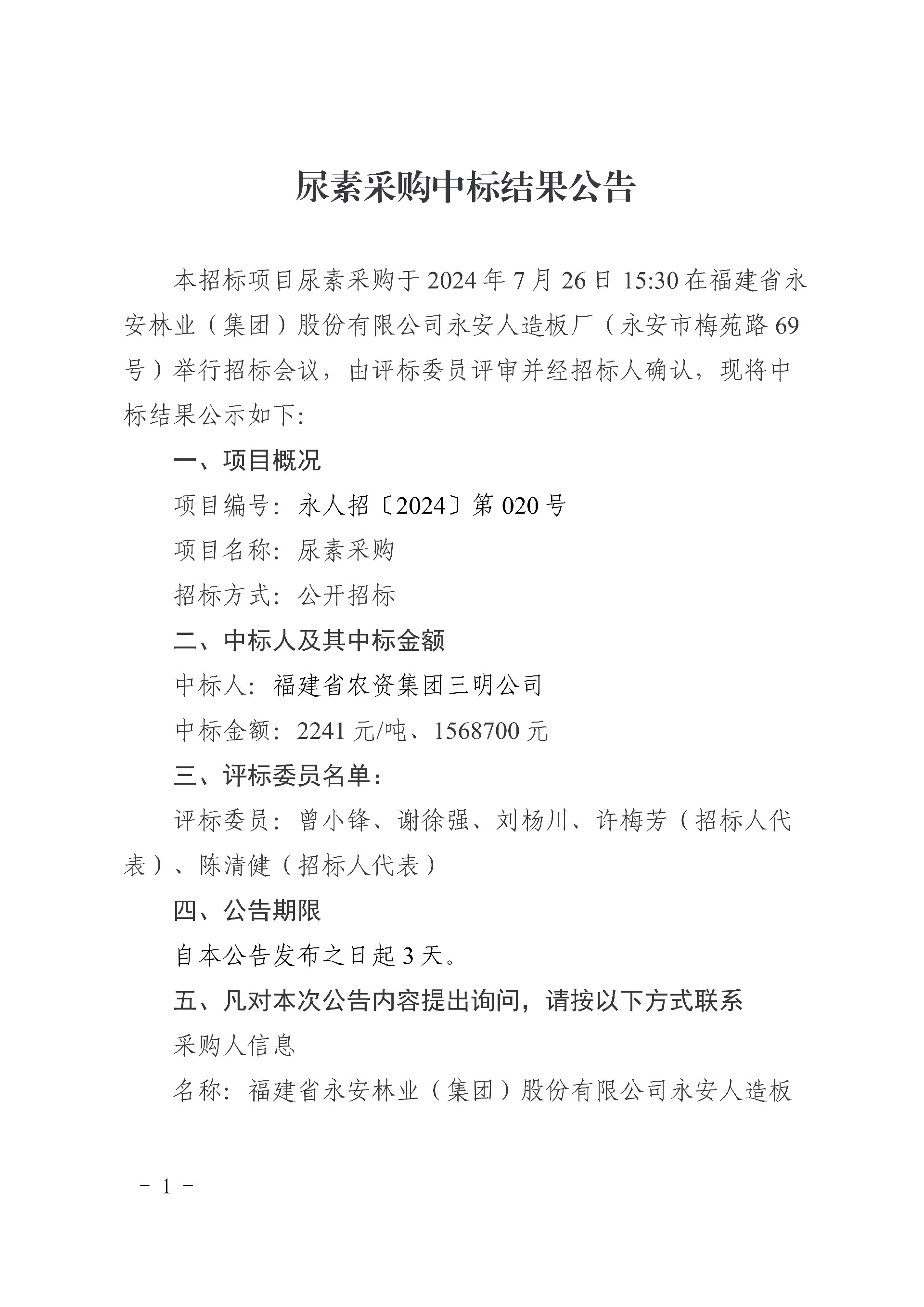 永安人造板廠三聚氰胺采購項目中標結果公告