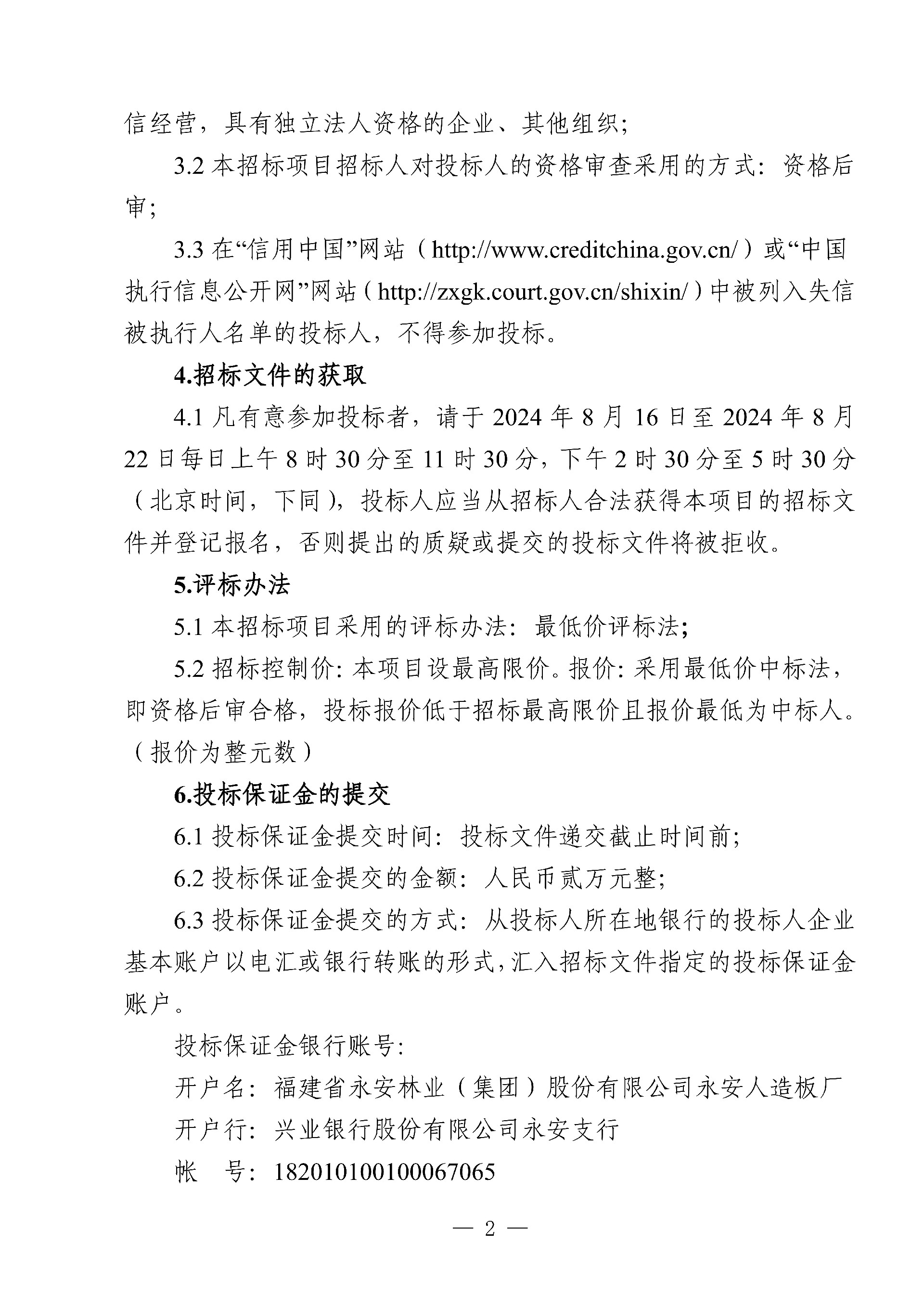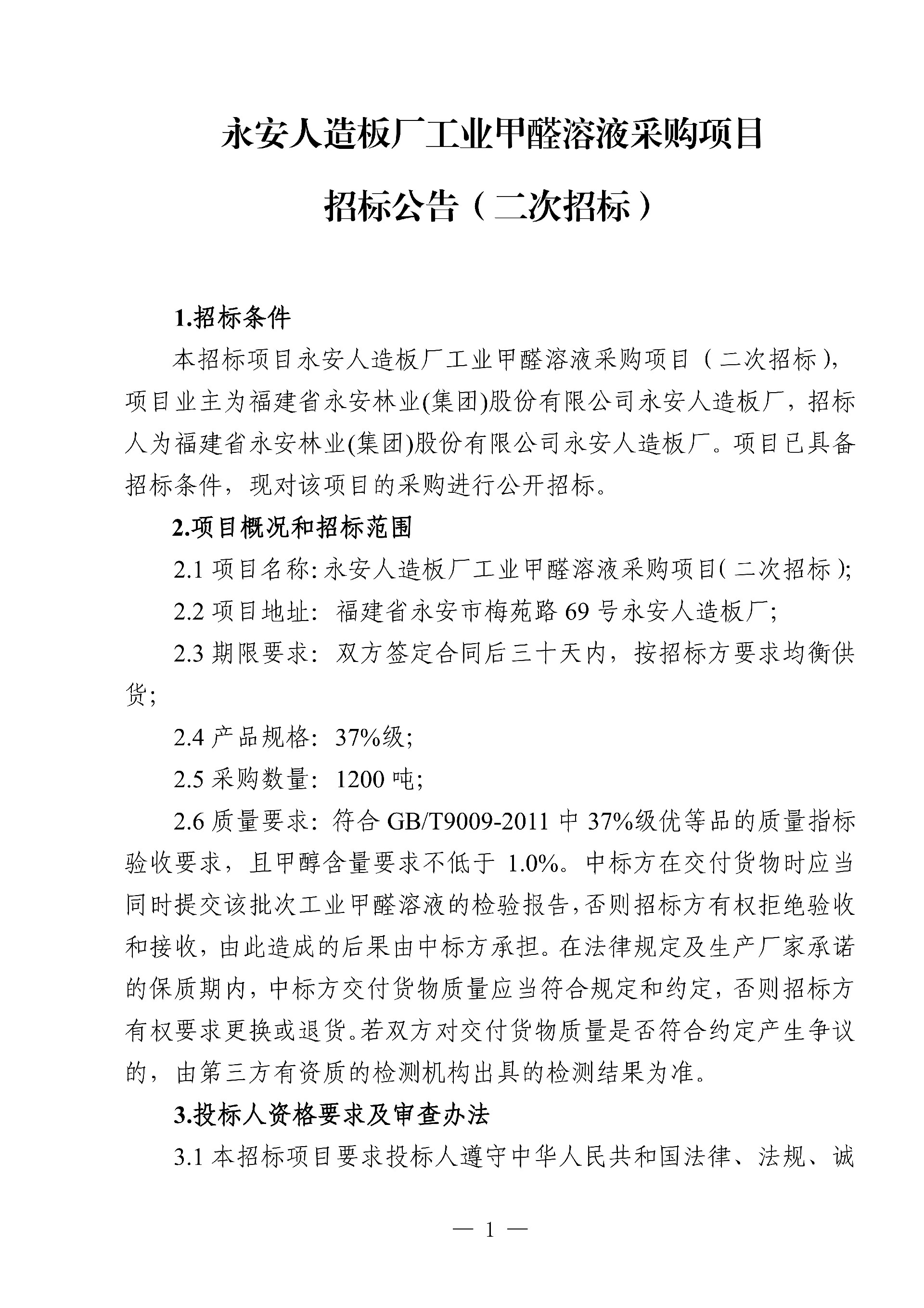 永安人造板廠工業甲醛溶液采購項目招標公告(二次招標)