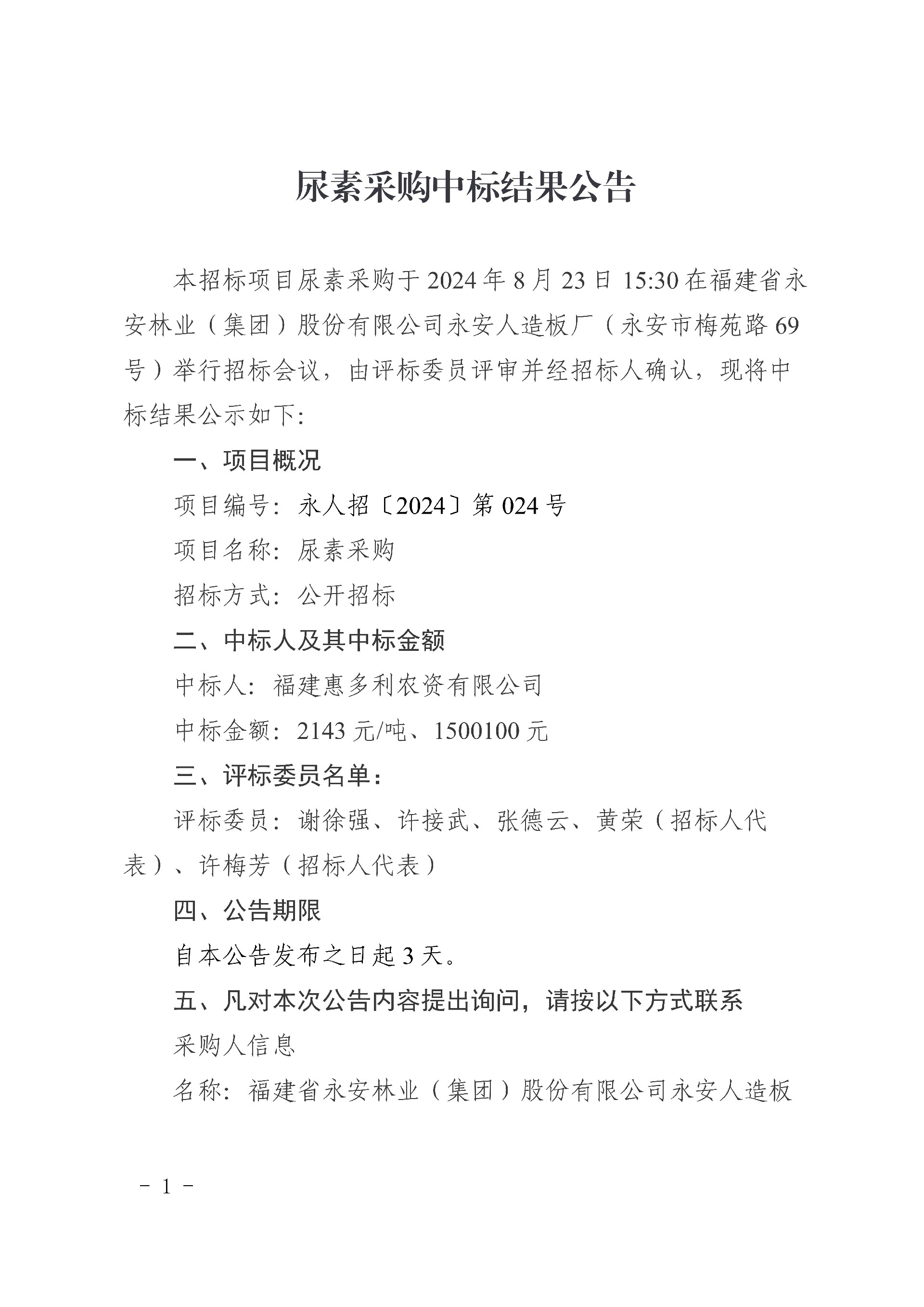 永安人造板廠尿素采購中標結果公告