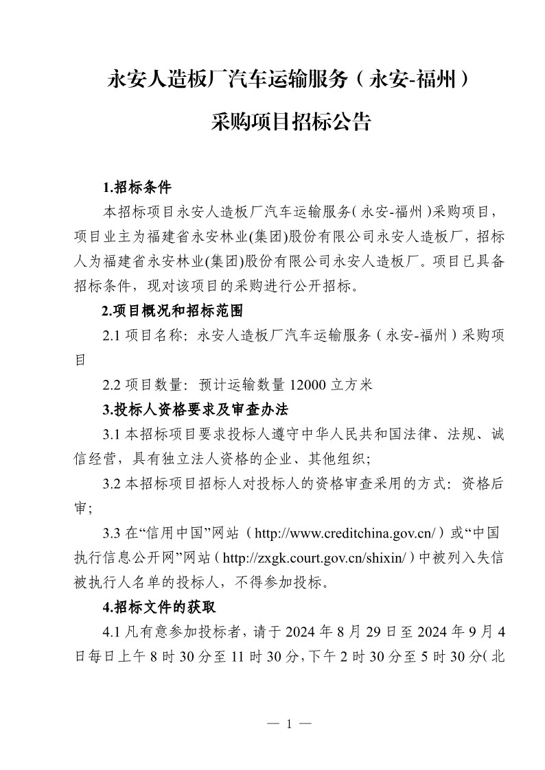 永安人造板廠汽車運輸服務(永安-福州) 采購項目招標公告