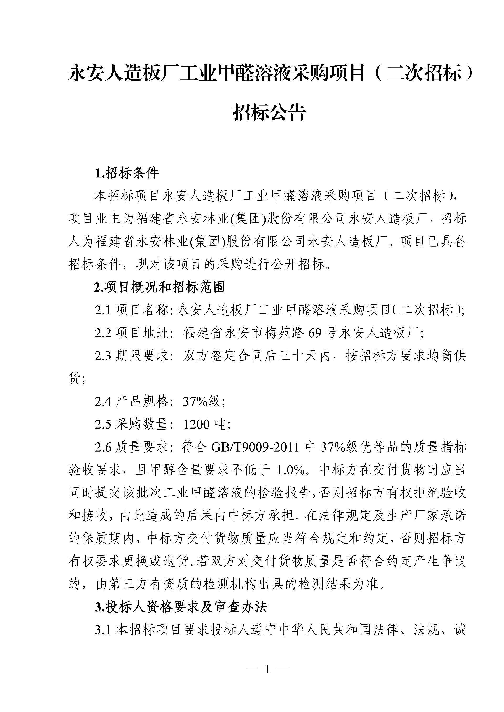 永安人造板廠工業甲醛溶液采購項目(二次招標)招標公告