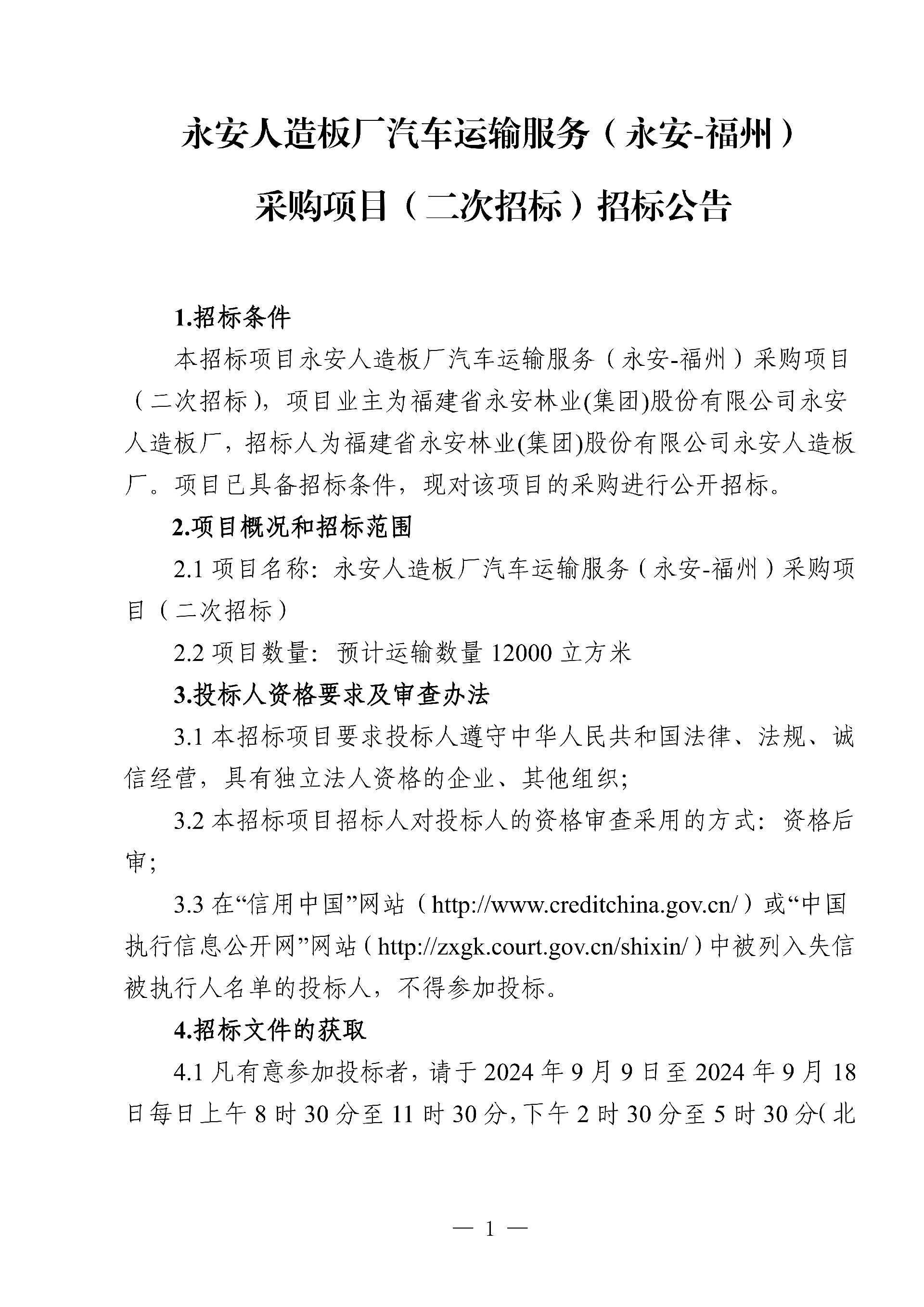 永安人造板廠汽車運(yùn)輸服務(wù)(永安-福州)采購項(xiàng)目(二次招標(biāo))招標(biāo)公告