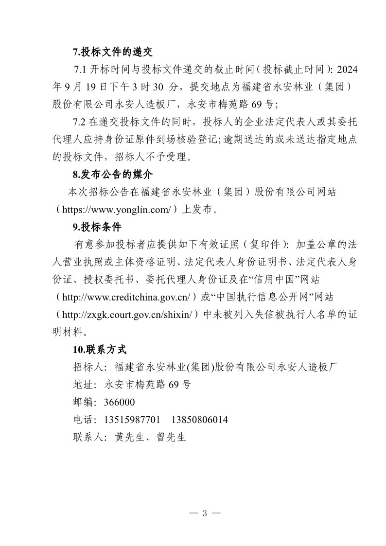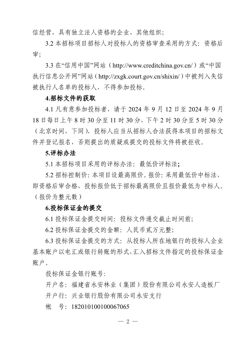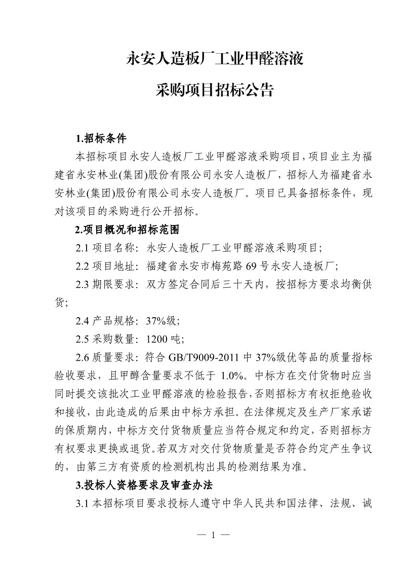 永安人造板廠工業甲醛溶液采購項目招標公告