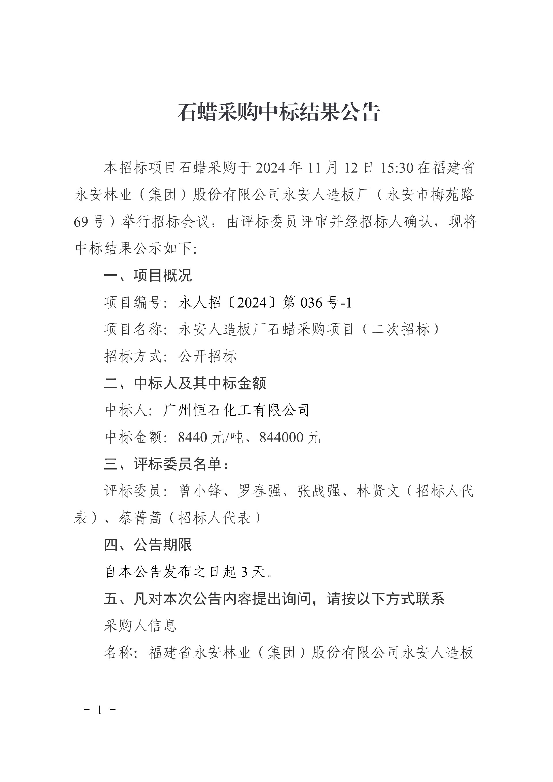 永安人造板廠三聚氰胺采購項目中標結果公告