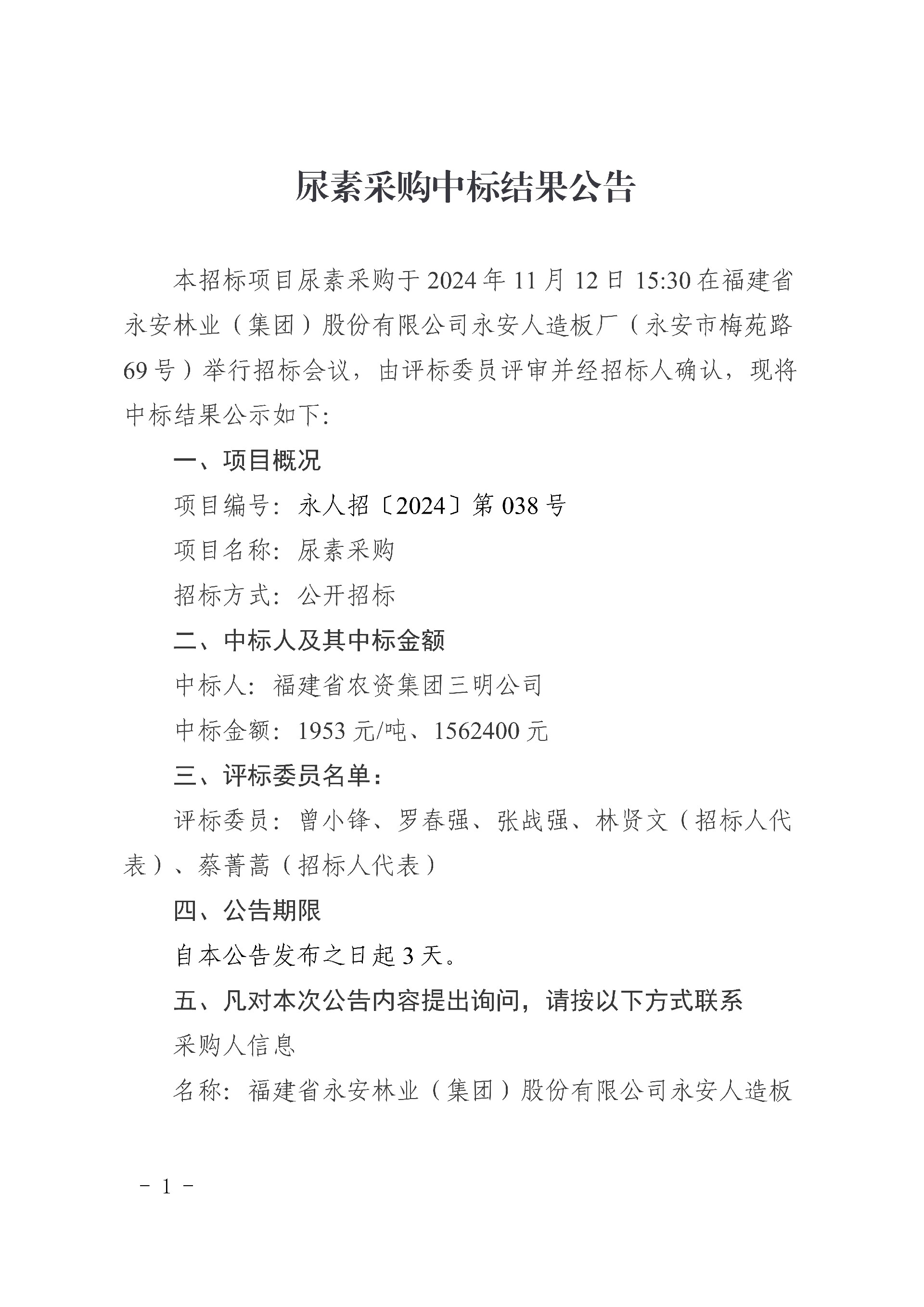 永安人造板廠尿素采購項(xiàng)目中標(biāo)結(jié)果公告