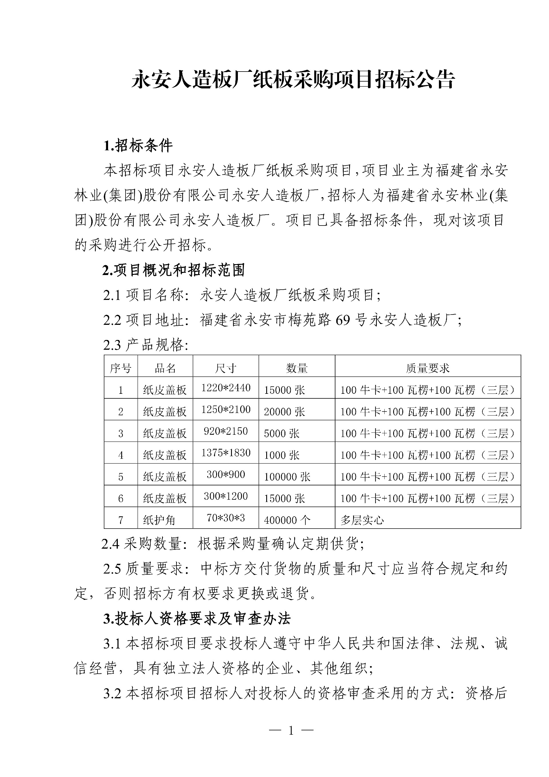 永安人造板廠紙板采購項目招標公告