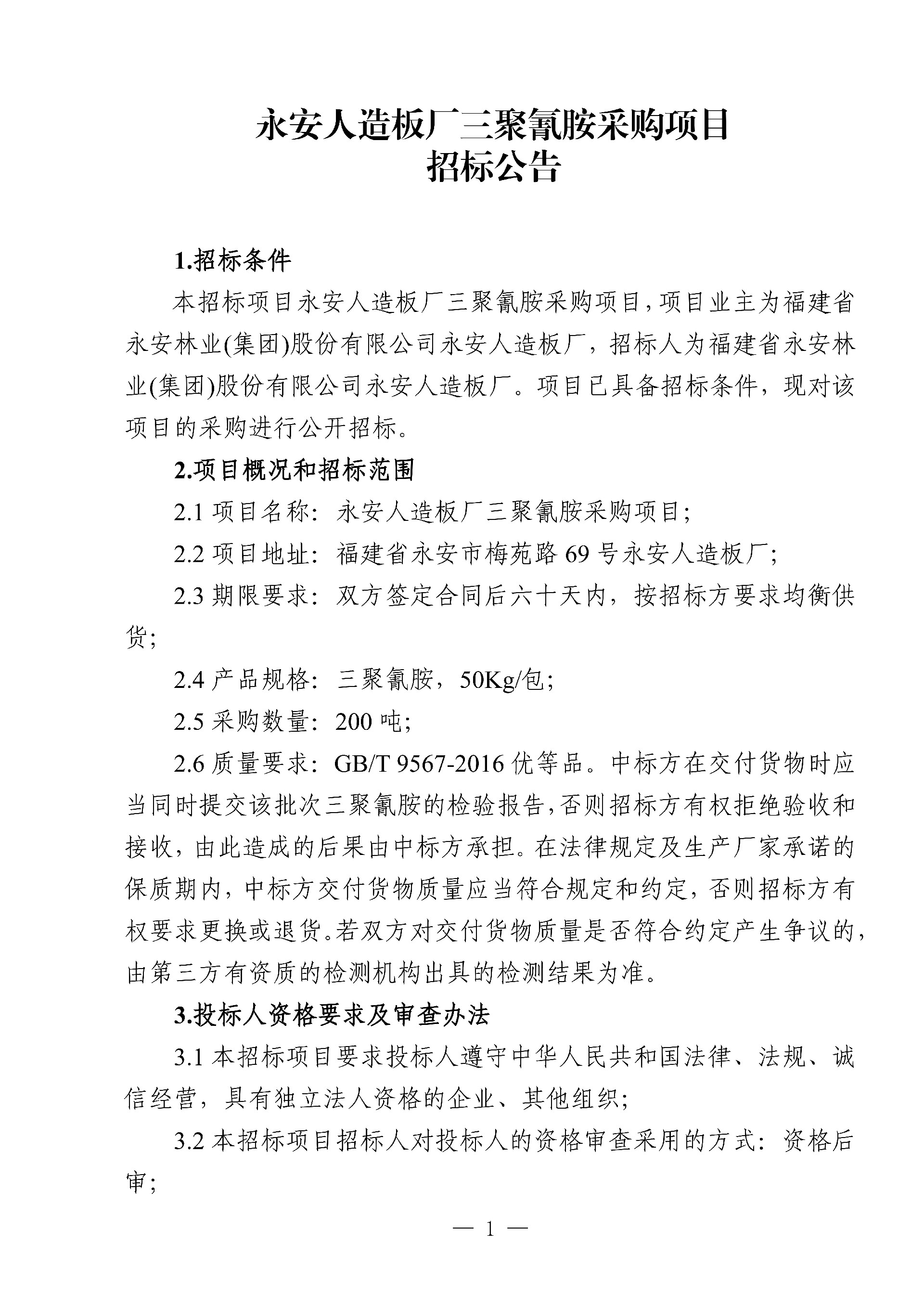 永安人造板廠三聚氰胺采購項目招標公告