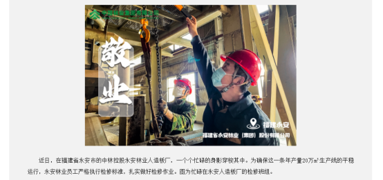 4月21日,國務院國資委官方網站宣傳欄目發布《中林集團繪就“春日奮進圖”》文章,永安林業報送的“愛崗敬業”圖作為中林集團的代表之一,成功入選。