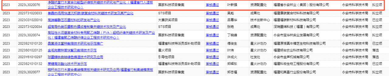 近日,福建省科學技術廳公布2023年度福建省中央引導地方科技發展資金項目擬立項企業項目公示清單,永安林業“凈醛抗菌竹木復合功能型纖維板關鍵技術研究與產業化”項目成功入選,項目類型為國家科技項目備案。