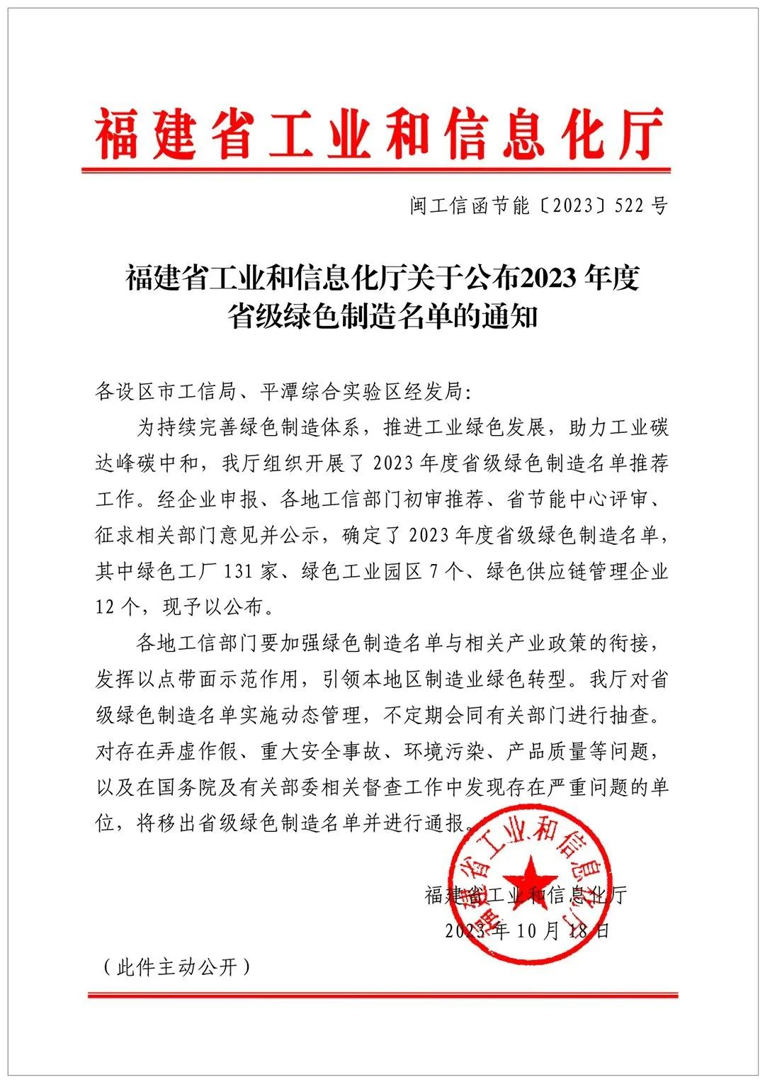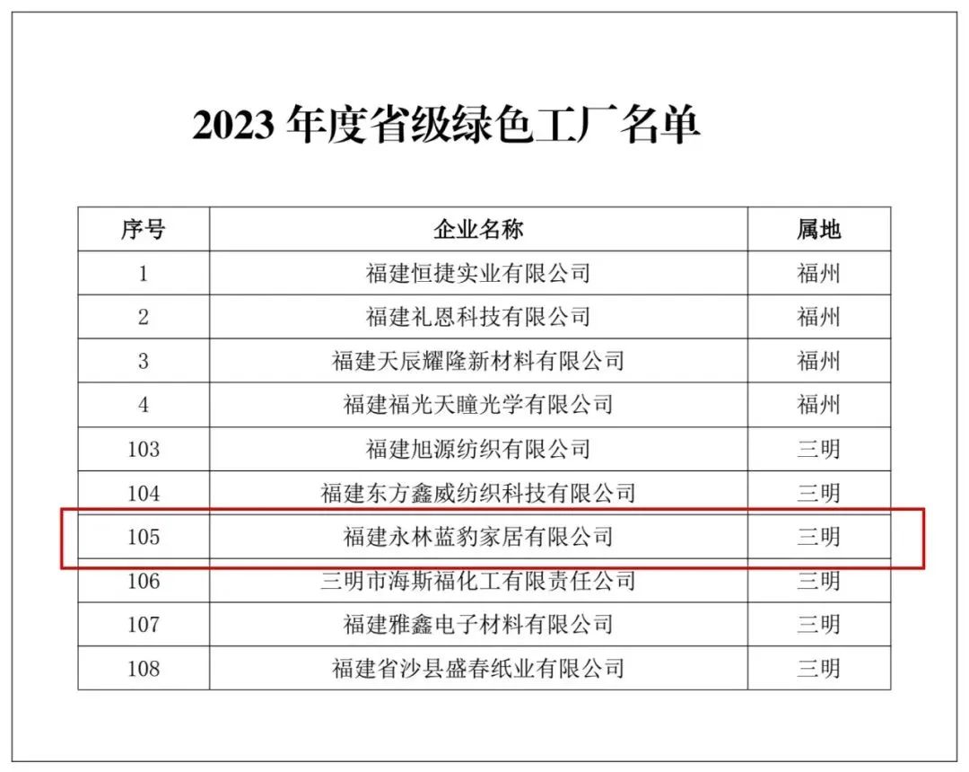 近日,福建省工業(yè)和信息化廳公布2023年度省級綠色制造名單,永安林業(yè)下屬全資子公司——福建永林藍豹家居有限公司成功入選該名單。永安林業(yè)企業(yè)綠色高質(zhì)量發(fā)展再添新績。